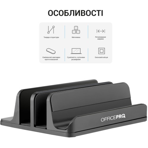 Вертикальна підставка OfficePro LS730G — ідеальне рішення для організації зберігання ноутбуків, смартфонів та планшетів різних розмірів. Завдяки регульованому широкому слоту, який варіюється від 13 до 38 мм, ви з легкістю помістите свої пристрої без зайвих клопотів.
