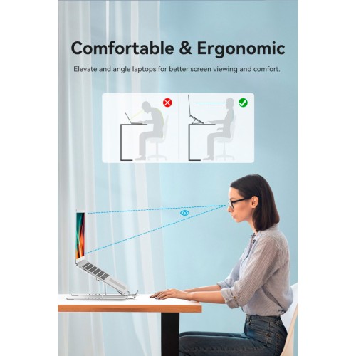 Підставка Vention Laptop X-type Stand Silver Aluminum Alloy призначена для планшетів і ноутбуків з діагоналлю до 17 дюймів. Вона має алюмінієву розтяжну конструкцію типу X, що забезпечує надійну підтримку та ефективне розсіювання тепла. Шість рівнів регулювання висоти (від 69 до 118 мм) дозволяють легко адаптувати підставку до різних умов.