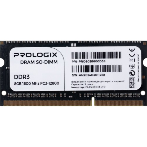 Модуль пам'яті для ноутбука SoDIMM DDR3 8GB 1600 MHz Prologix (PRO8GB1600D3S)