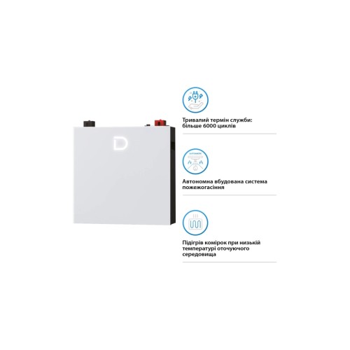 Кожна деталь Dyness DL5.0C Pro продумана до дрібниць. Металевий корпус захищає елементи від перегріву та механічних впливів, пасивне охолодження усуває шум і не потребує обслуговування. Робочі діапазони від −20°C до +55°C дозволяють експлуатувати батарею цілий рік, а опція автопідігріву допомагає у холодному кліматі. Заряд до 75 А і робоча напруга 44.8–57.6 В забезпечують гнучкість у налаштуванні систем, а компактні розміри (усього 488×515×150 мм) дозволяють монтувати модуль навіть у шафі чи на стіні поруч з інвертором. Dyness не просто постачає батареї — вона створює розумні рішення для реальних умов.