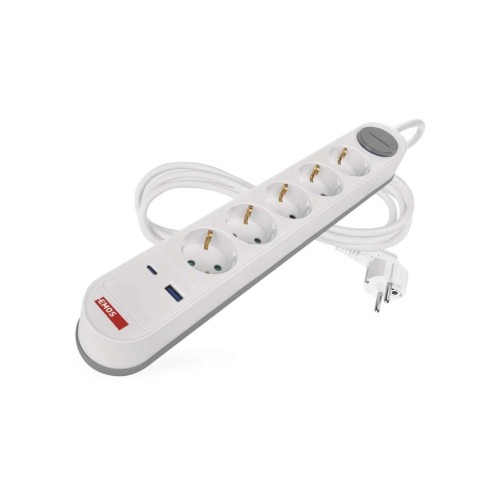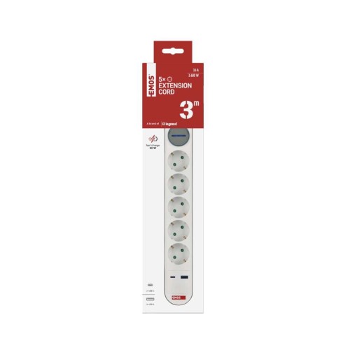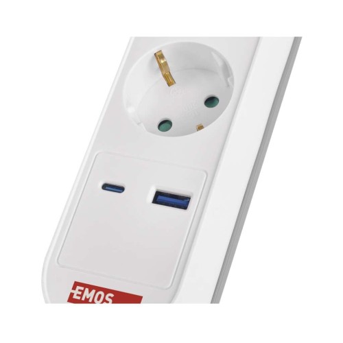 Сучасний подовжувач EMOS P1523FC із 5 розетками та портами USB-A і USB-C, кабель довжиною 3 м. Ідеальний для підключення та зарядки декількох пристроїв у домашньому або офісному середовищі.