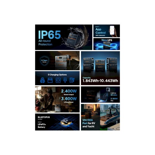 Зручна для використання на вулиці конструкція та водо- і пилозахищеність за стандартом IP65 забезпечують стійкість до дощу, бруду, пилу та сольової корозії. У поєднанні з оптимальною вентиляцією для захисту внутрішніх компонентів, Bluetti AC240P - це ваш помічник у будь-якому місці та в будь-якій справі!