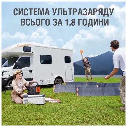 • Швидкий заряд — всього за 1,8 години від мережевої розетки або чотирьох сонячних панелей SolarSaga 200 Вт. Сумісний з усіма сонячними панелями Jackery — ідеально підходить для кемпінгу та відключень світла.