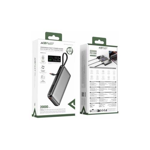 Батарея універсальна Acefast 20000mAh 130W PD, QC/3.0 USB-A+USB-C In/Out,build-in cable M22 Gray (6974316283904)