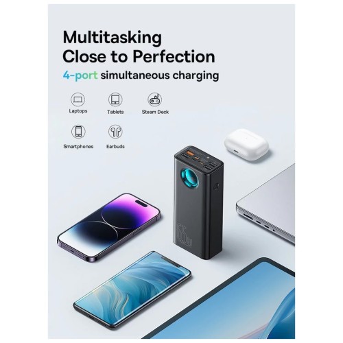 Оснащений універсальним набором портів, повербанк Baseus Amblight має всі можливості для одночасного підзаряджання до 5 пристроїв. Порт USB Type-C з вихідною потужністю до 65 Вт можна використовувати для швидкого заряджання будь-яких сумісних пристроїв, включаючи ноутбуки. Порти USB-А мають потужність 15/30 Вт і відмінно справляються з підзарядкою різних девайсів. Для підзарядки самого повербанка використовуються порти USB Type-C, Lighting та Micro.
