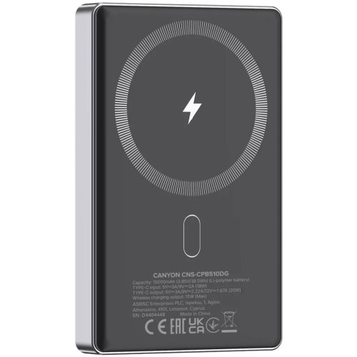 Батарея універсальна Canyon 10000mAh OnPower 510 slim Magsafe PD/20W Dark Grey (CNS-CPB510DG)