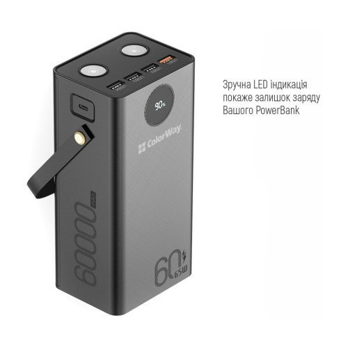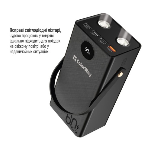 Високоякісний та функціональний зовнішній мобільний акумулятор (УМБ) ColorWay оснащений потужним літій-полімерним акумулятором ємністю 60000 мА*год, що робить його ідеальним рішенням для великого резервного джерела живлення. Цей акумулятор може заряджати не лише мобільні пристрої, а й ноутбуки з роз'ємом Type-C до 65 Вт. Додатковим плюсом є наявність двох вбудованих світлодіодних ліхтариків, які можуть служити резервним джерелом освітлення.