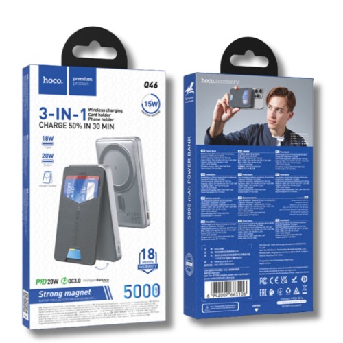 "Повербанк Hoco Q46 Title PD20W Magnetic (5000 mAh) — це компактний магнітний повербанк формату 3-в-1, який поєднує в собі зовнішній акумулятор, бездротову зарядку Qi та зручний кардхолдер-підставку для смартфона.