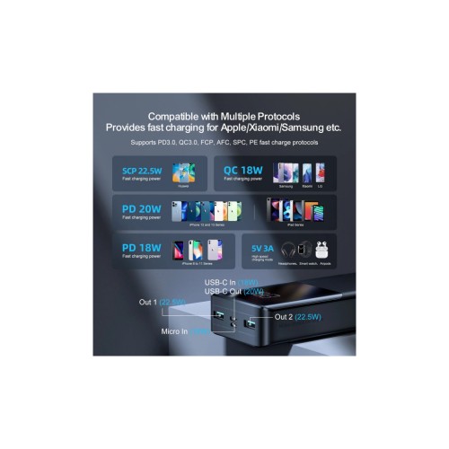 Зовнішній акумулятор Joyroom LED Display Quick Charge обладнаний чотирма портами — двома USB-A й одним USB-C, а також портом Micro-USB. Останні два також використовуються для заряджання самого повербанка. Вам не потрібно вибирати, який саме ґаджет зарядити першим, просто під'єднуйте одночасно все, що вам потрібно. Портативний пристрій підтримує протоколи швидкого заряджання PD3.0, QC3.0, AFC, FCP, SCP і PE, що в рази скоротить час заряджання ґаджетів.