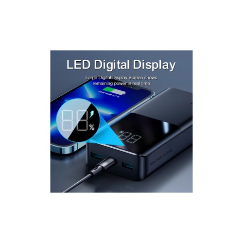 Корпус повербанк виготовлений із пожежобезпечного ABS-матеріалу в мінімалістичному дизайні. До комплекту входить сам блок живлення Joyroom і 1 кабель USB-Type C. Великий цифровий світлодіодний дисплей дає змогу контролювати решту енергії та стан заряджання акумулятора. Габарити портативної батареї комфортні для щоденного використання, а отже, ви можете розмістити її в рюкзаку або сумці. На корпусі не видно відбитків пальців, водночас павербанк не ковзає в долоні.