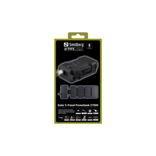 Батарея універсальна Sandberg 27000mAh Solar 5-Panel 8W, PD/20W, IP54, Flashlight, wireless charging 15W (421-06)