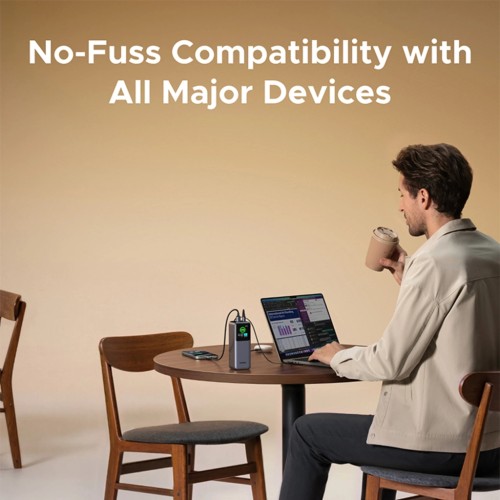 • Висока потужність 165 Вт: Завдяки загальному розподілу потужності 165 Вт цей пристрій оптимізовано для виконання складних завдань, і він здатний швидко зарядити 16-дюймовий MacBook Pro від 0% до 43% всього за 30 хвилин через виділений вихід потужністю 100 Вт. Така висока потужність дозволяє користувачам живити два ноутбуки одночасно або комбінацію ноутбука та смартфона на максимальній швидкості, значно скорочуючи час простою для професіоналів, які працюють віддалено або часто подорожують.