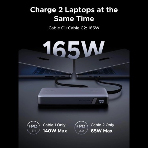 Завдяки потужності до 165 Вт цей павербанк легко заряджає навіть ноутбуки, MacBook Pro, планшети, смартфони та інші гаджети із підтримкою швидкої зарядки. Один із вбудованих USB-C кабелів видає до 140 Вт, що робить його ідеальним для потужних пристроїв.