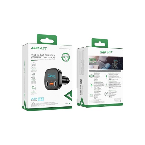 Acefast B5 — трьохпортовий швидкий автомобільний зарядний пристрій потужністю 101 Вт з OLED-дисплеєм. На дисплеї відображається інформація про напругу, струм і потужність кожного порту. Він дає користувачу можливість чітко моніторити стан заряджання в режимі реального часу. OLED-дисплей має привабливий вигляд і високу чіткість. Усі три порти Acefast B5 підтримують кілька протоколів швидкого заряджання, що дозволяє швидко поновити запас енергії в більшості пристроїв, як-от телефони, планшети, портативні комп'ютери.