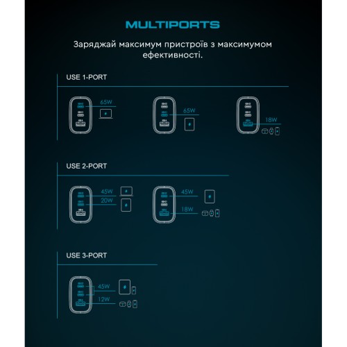 • Вихід USB-C1/C2: 5В/3А, 9В/3А, 12В/3А, 15В/3А, 20В/3,25А