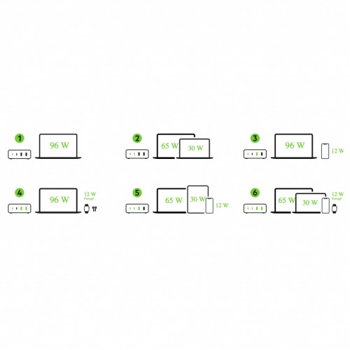 Обладнаний чотирма портами — двома USB Type-C та двома USB-A, цей зарядний пристрій здатний одночасно підтримувати декілька гаджетів. Максимальна вихідна потужність становить 108 Вт, а вихідний струм досягає 5 А, що робить його незамінним для швидкого відновлення заряду таких потужних пристроїв, як MacBook, iPad, iPhone, Samsung, а також інших смартфонів та планшетів.
