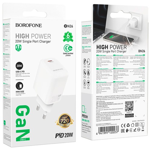 Мережевий зарядний пристрій Borofone BN26 Fuente single-port PD20W charger (EU) White — це високоякісний зарядний пристрій з одним портом USB Type-C, який підтримує технологію швидкої зарядки Power Delivery (PD) потужністю до 20 Вт. Компактний і зручний у використанні, він забезпечує стабільне заряджання ваших пристроїв, включаючи смартфони, планшети та інші гаджети.