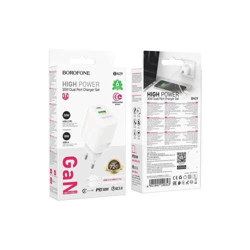 Зарядний пристрій BOROFONE BN29 Fuente 1xUSB-C PD30W + 1xUSB QC3.0 White (6941991120329) — ваша універсальна відповідь на всі потреби у швидкому та надійному зарядженні. Поєднуючи інноваційні технології Power Delivery 3.0, Quick Charge 3.0 та Programmable PowerSupply (PPS), цей адаптер пропонує максимальну ефективність зарядки для різноманітних гаджетів — від смартфонів і планшетів до смарт-годинників, фітнес-браслетів, TWS навушників, та навіть екшн-камер і геймпадів.