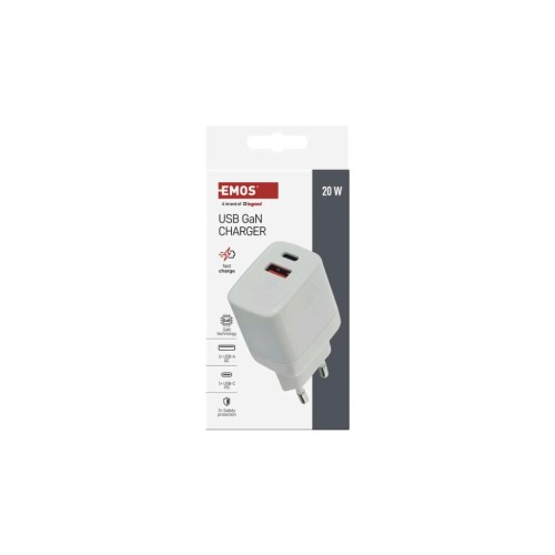 Зарядний пристрій EMOS V02G20 GAN 1xUSBA + 1xUSBC PD20W (P0075)