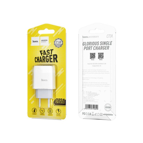Hoco C72A Glorious single port charger White - мережевий зарядний пристрій з одним USB-портом.