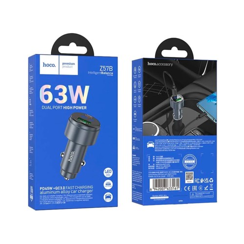 Автомобільний зарядний пристрій HOCO Z57B Glorious оснащений портом USB-A потужністю 18 Вт та портом USB-C потужністю 45 Вт, що дозволяє йому здійснювати швидку зарядку з підтримкою різних протоколів, включаючи PD45W, QC3.0, FCP та AFC. Виготовлений із міцного алюмінієвого сплаву, HOCO Z57B Glorious забезпечує надійність та безпеку завдяки вбудованому захисту від перевантаження, перенапруги та перегріву. Якісні контакти встановлюють стійке з’єднання та гарантують ефективну та безпечну зарядку ваших девайсів. Дизайн пристрою доповнюється елегантним LED-дисплеєм, який відображає напругу та робить використання АЗП зручним у темряві.