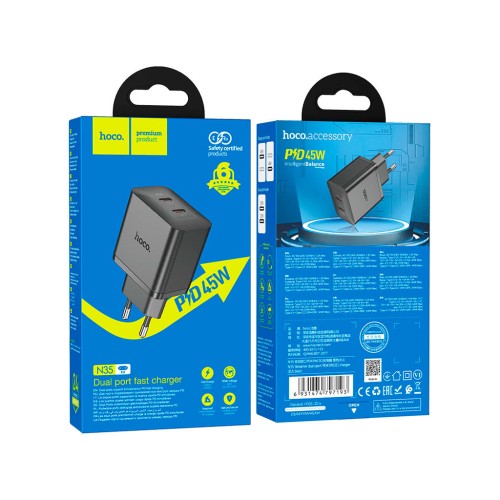 Зарядний пристрій HOCO N35 Streamer 2xUSB-C PD45W GaN Black (6931474797193)