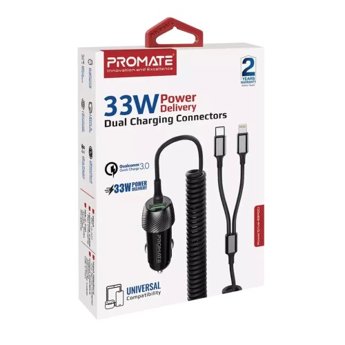 Promate PowerDrive-33PDCi - ідеальне рішення для швидкої та ефективної зарядки твоїх пристроїв у машині. А вбудовані спіральні USB-C і Lightning кабелі оптимізують простір в авто та позбавлять необхідності купівлі додаткових проводів.