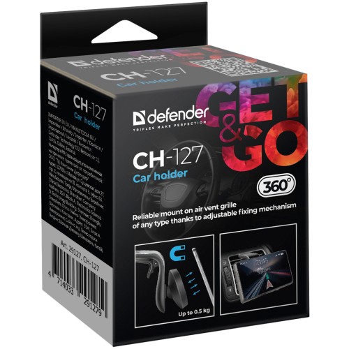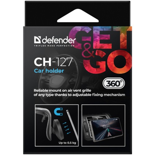 Автотримач магнітний Defender CH-127 підходить для всіх типів смартфонів. Компактний розмір тримача дає змогу брати його із собою в подорожі та використовувати на іншому автомобілі. Надійна фіксація на решітці вентиляції будь-якого типу завдяки регульованому кріпленню тримача. Легко перетворюється на підставку з кількома можливими кутами огляду для перегляду відео або набирання тексту. Пристрій повертається на 360° градусів і фіксується в будь-якій позиції! Металеві пластини для кріплення смартфона на тримачі входять до комплекту.