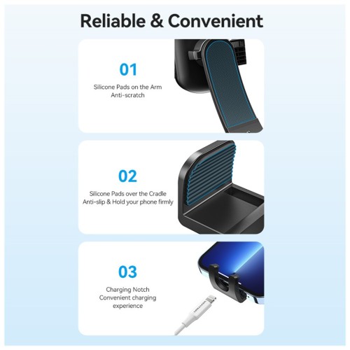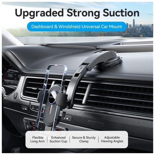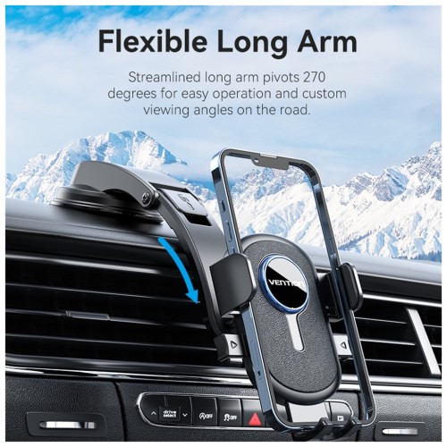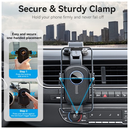 VENTION KSCB0 — універсальний автомобільний тримач для смартфона з механізмом One Touch Clamp, що дозволяє швидко фіксувати телефон однією рукою. Надійна присоска забезпечує міцне кріплення на лобовому склі або панелі приладів, а регульований кронштейн дозволяє налаштувати оптимальний кут огляду.