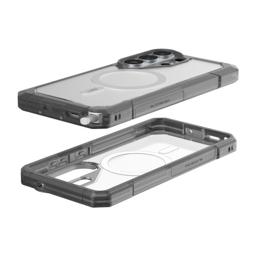 UAG Trooper with Magnet Clear/Ash for Samsung Galaxy S26 Ultra — захищений чохол із прозорою, напівполіпропіленовою оболонкою та вбудованим магнітним модулем для бездротової зарядки. Конструкція двох шарів поєднує тверду зовнішню обшивку й м’яке внутрішнє ядро для якісної амортизації ударів. Забезпечує тестовану падіннєву стійкість відповідно до військового стандарту до ~9,1 м. Підтримує роботу з бездротовим заряджанням та більшістю аксесуарів MagSafe.