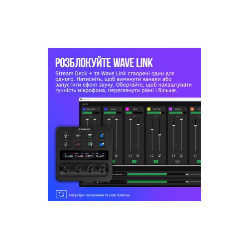 Stream Deck+ та Wave Link створені один для одного. Вимкніть звук каналів або запускайте спецефекти одним дотиком. Налаштуйте звук мікрофона поворотом ручки, контролюйте рівні та багато іншого.