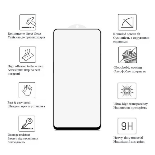 • Панель навколо екрана залита кольором, завдяки чому наклеєне скло практично не відрізнити від стандартної передньої панелі смартфона