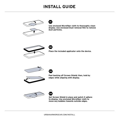 Для зручності встановлення у комплект входить повний набір аксесуарів: монтажна рамка, волога серветка, серветка з мікрофібри та наклейка для видалення пилу. Такий набір дає змогу легко й без бульбашок повітря встановити скло навіть удома, отримавши професійний результат.