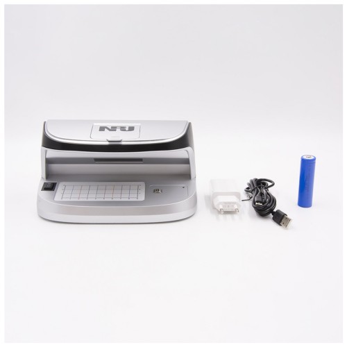 Працює від акумулятора У пристрої також є вбудоване збільшувальне скло для перевірки мікродруку та шкала для вимірювання розмірів банкноти. Наявність донного підсвічування дозволяє перевірити спектр фарби, як додаткова детекція для виявлення підроблених купюр. Усі 4 методи визначення справжності купюр можна застосовувати одночасно чи окремо. Дана модель детектора є простим та надійним пристроєм, розрахованим на тривалу експлуатацію. Має компактний дизайн, зручний у використанні. Ідеально підійде для невеликих місць продажу, пунктів обміну валют та інших місць, де невеликий потік банкнот і потрібно провести поверхневу перевірку банкнот на справжність.