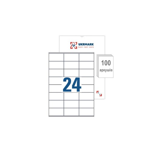 UKRMARK A4-24-02-W1-100, 24 етикетки на аркуші А4, 70мм х 37мм, уп.100 аркушів, етикетки самоклейні