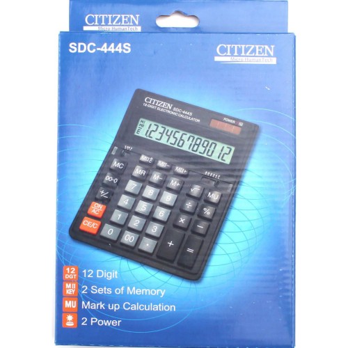 Калькулятор Citizen SDC-444S (1244) допоможе легко зробити різні підрахунки, обчислити відсотки, підрахувати підсумкову суму. Передбачено автоматичне вимикання живлення. Особливості: дисплей: фіксований кутовий; тип пам'яті: дворівнева пам'ять; клавіші введення розрядів: клавіша "00"; живлення: елемент живлення і сонячна батарея.