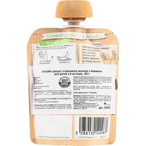 Дитяче пюре BabyBio Органічне з вівсяного молока з бананом 85 г (54098)