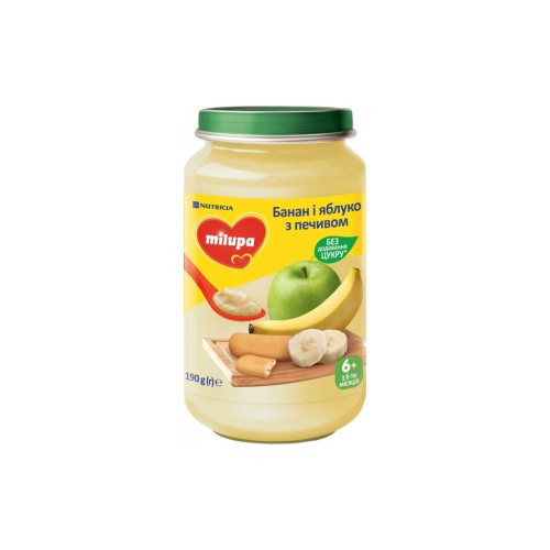 Фруктове пюре «Банан і яблуко з печивом» Milupa у форматі скляної упаковки — це смачне та корисне пюре для малюків від 6 місяців. Ніжна текстура та приємний смак фруктового пюре в несподіваному поєднанні з улюбленим печивом безсумнівно сподобається вашій дитині, і малюк буде їсти його з чудовим апетитом.