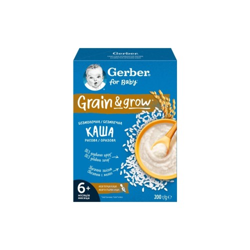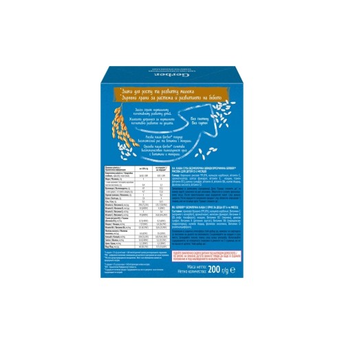 Дитяча безмолочна швидкорозчинна каша Gerber рисова підходить для початку введення каші в раціон дитини. Вона не містить глютен, без доданого цукру* та збагачена залізом, для нормального когнітивного розвитку дитини. Рисова каша Gerber поєднує високоякісний рис та вітаміни і мінерали.