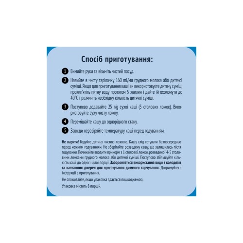 Не варити! Годуйте дитину чистою ложкою. Кашу слід готувати безпосередньо перед кожним годуванням. Не зберігайте розведену кашу, що залишилась після годування. Починайте вводити прикорм з 1 столової ложки, розведеної 4-5 столовими ложками грудного молока або дитячої суміші. Поступово збільшуйте кількість каші до однієї цілої порції. Забороняється використання води з колодязів та каптажних джерел для приготування дитячого харчування. Дотримуйтесь інструкції з приготування.