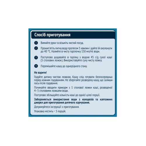 Прокип’ятіть 150 мл води і потім остудіть її до 35-40 градусів. Перелийте цю воду в чисту тарілку і починайте поступово всипати в неї суміш. Всього необхідно додати 4-5 столових ложок суміші. Ретельно все перемішайте. Каша готова!