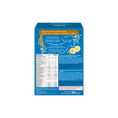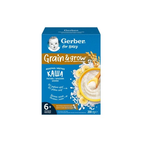 Перша молочна дитяча швидкорозчинна каша Gerber рисова з бананами підходить для продовження введення рисової каші в раціон дитини. Вона не містить глютен, без доданого цукру* та збагачена залізом, для нормального когнітивного розвитку дитини. Рисова каша Gerber поєднує високоякісний рис та вітаміни і мінерали.