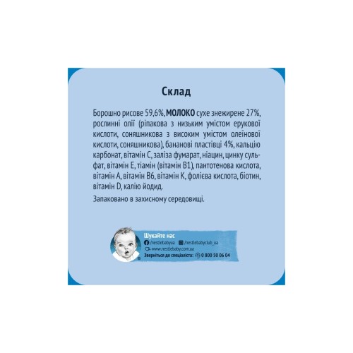 Склад: борошно рисове 59.6%, молоко сухе знежирене 27%, рослинні олії (ріпакова з низьким умістом ерукової кислоти, соняшникова з високим умістом олеїнової кислоти, соняшникова), бананові пластівці 4 %, кальцію карбонат, вітамін С, заліза фумарат, ніацин, цинку сульфат, вітамін Е, тіамін (вітамін В1), пантотенова кислота, вітамін А, вітамін В6, вітамін К, фолієва кислота, біотин, вітамін D, калію йодид.