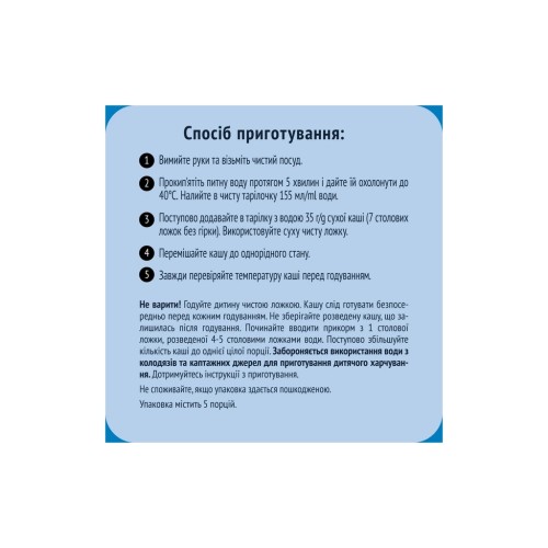Не варити! Годуйте дитину чистою ложкою. Кашу слід готувати безпосередньо перед кожним годуванням. Не зберігайте розведену кашу, що залишилась після годування. Починайте вводити прикорм з 1 столової ложки, розведеної 4-5 столовими ложками води. Поступово збільшуйте кількість каші до однієї цілої порції. Забороняється використання води з колодязів та каптажних джерел для приготування дитячого харчування. Дотримуйтесь інструкції з приготування.