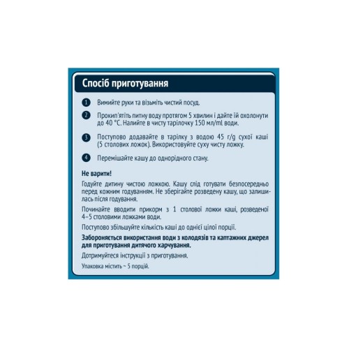 Прокип’ятіть 150 мл води і потім остудіть її до 35-40 градусів. Перелийте цю воду в чисту тарілку і починайте поступово всипати в неї суміш. Всього необхідно додати 4-5 столових ложок суміші. Ретельно все перемішайте. Каша готова!