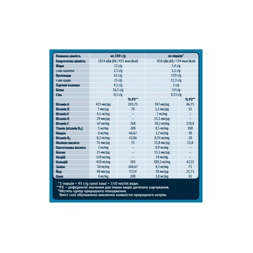 До складу входять: 33,7% вівсяного цільнозернового борошна з глютеном, 29,4% пшеничного борошна з глютеном, 18% сухого знежиреного молока, 9% сухого цільного молока, ріпакова олія з низьким вмістом ерукової кислоти, соняшникова олія з високим вмістом олеїнової кислоти, 3% бананових пластівців, 3% мангових пластівців (манго та кукурудзяний крохмаль), 2% яблучних пластівців (яблука, кукурудзяний крохмаль, мальтодекстрин, емульгатор лецитин соняшниковий), вітаміни С, Е, В1, А, В6, К, D, кальцію карбонат, заліза фумарат, ніацин, сульфат цинку, пантотенова кислота, фолієва кислота, біотин, йодином калію.