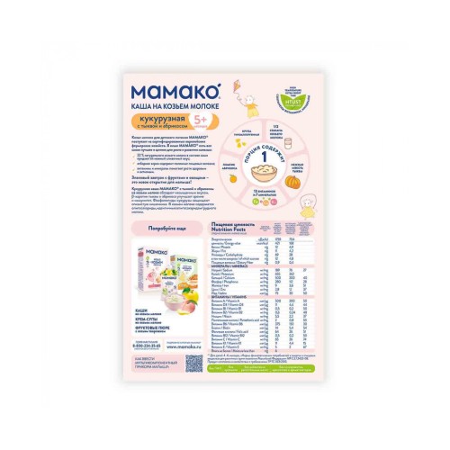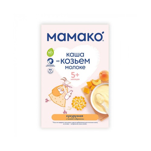 Швидкорозчинна каша на козячому молоці Мамако виготовлена за унікальною рецептурою. Фосфоліпіди кукурудзи надають захисну і протизапальну дію на ніжну травну систему малюка. Високий вміст клітковини в натуральному гарбузі і абрикосі в поєднанні з козячим молоком покращує мікрофлору і роботу кишечника. Природні джерела каротину (кукурудза, гарбуз і абрикос) корисні для зору, зміцнюють імунітет і надають каші сонячний колір і яскравий смак.