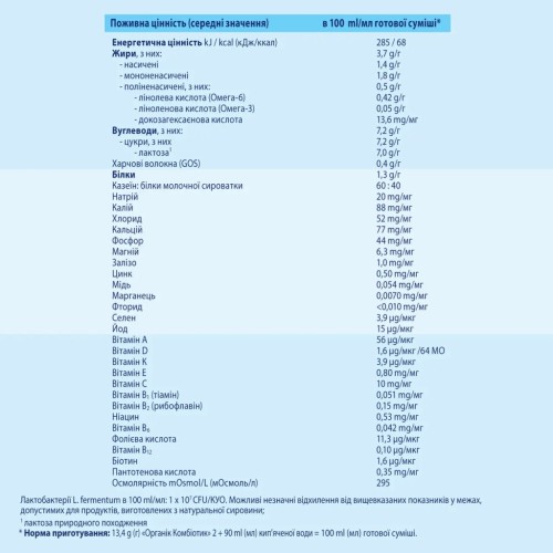 Суміш містить пребіотик GOS і пробіотик L. fermentum, які клінічно доведено сприяють формуванню здорової мікрофлори кишківника, важливої для травлення та імунної системи.