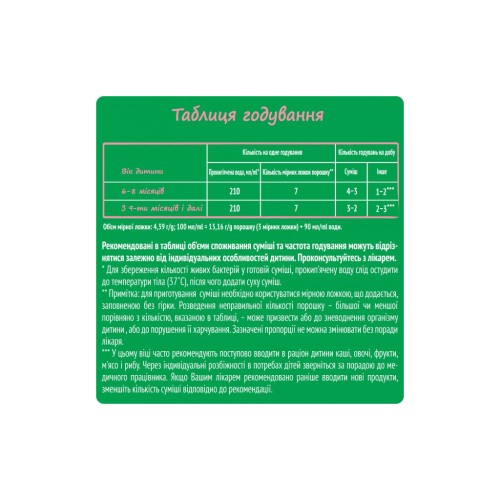 Попередження: суміш слід готувати безпосередньо перед кожним годуванням. Точно дотримуйтесь інструкції. Готова суміш, що залишилася після годування, не повинна зберігатися і використовуватись в подальшому. Для збереження кількості живих бактерій у готовій суміші, прокип'ячену воду слід остудити до температури тіла (37˚С), після чого додати суху суміш. Для приготування суміші необхідно користуватися мірною ложкою, що додається, заповненою без гірки. Розведення неправильної кількості порошку може призвести або до зневоднення організму дитини, або до порушення її харчування. Зазначені пропорції не можна змінювати без поради лікаря.