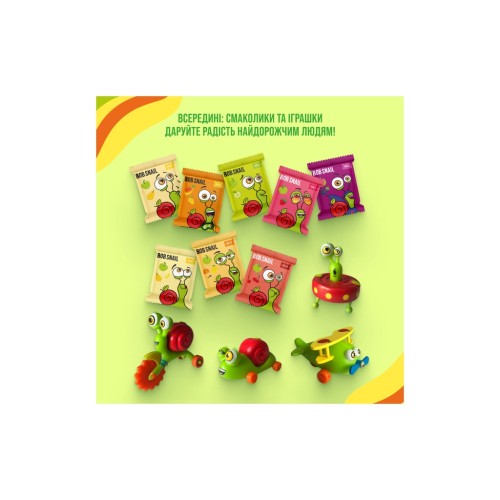 14 фруктових смаколиків без доданого цукру, консервантів, глютену, ГМО та барвників: 9 ролів та 5 мармеладок в індивідуальному пакованні 10 ексклюзивних іграшок з нової колекції «ТурбоБоб»